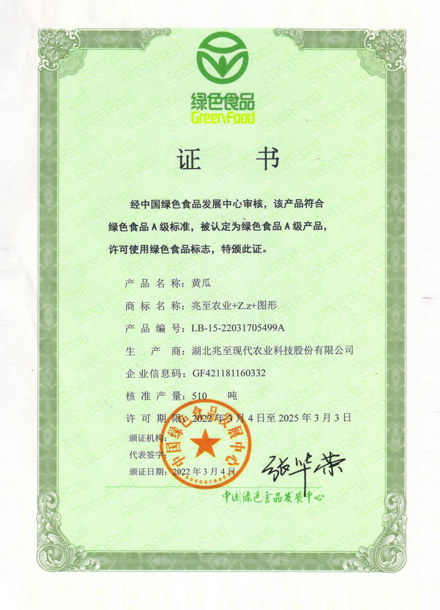 黃瓜綠色食品證書